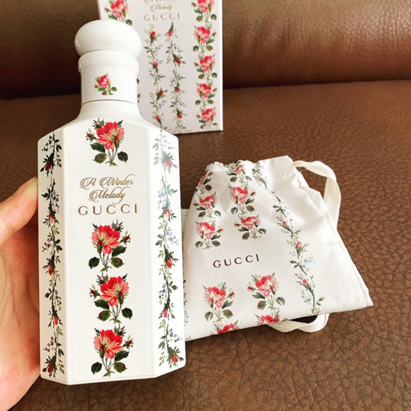 Chai nước hoa được trang trí bởi các chi tiết kim loại mạ vàng, tạo nên một sự tương phản ấn tượng với màu sơn mài ngà. Trên thân chai, chúng ta có thể thấy nhãn hiệu Gucci được khắc nổi bật, tôn lên vẻ đẹp và sự quyến rũ của sản phẩm.